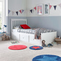Presenting Quest, a masterpiece of contemporary design, seamlessly combining style with functionality. Crafted from solid Rubberwood, this bed exudes both durability and elegance. Its modern colour finish adds a touch of sophistication to any bedroom decor. Discover the art of discreet storage with the Quest bed. The seamlessly integrated storage drawers within the frame offer a clutter-free and streamlined aesthetic. Now, you can keep your bedroom organized while maintaining a clean, uncluttered look. The practical drawers are perfect for stowing away extra linens, clothing, or any items you want to keep within easy reach. Featuring a charming slatted headboard, along with detailed footboard craftsmanship, the Quest bed is a true testament to thoughtful design. A solid slatted base adds an extra layer of comfort and support to your mattress, ensuring a good night's sleep for all ages. Whether it's a child, teenager, or adult, the Quest bed provides the perfect foundation for restful nights.