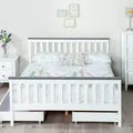 Stunning white bed frame finished with grey top trims. A storage drawer will be included. Made from solid Pine wood. Very strong plywood slats. Assembled size, L 210cm, W 160cm, Headboard H 82cm, Footboard H 62cm. Internal Drawer Size, W 130cm, D 63cm, H 10cm. Come flat pack for easy shipping and home assembly.